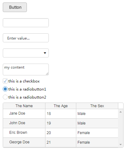 var treelist = new KQ.ui.TreeList('treelist', { columns: [ {field: "name", title: "The Name"}, {field: "age", title: "The Age", width: 100}, {field: "sex", title: "The Sex"}, ], dataSource: [ {name: "Jane Doe", age: 18, sex: "Male"}, {name: "John Doe", age: 19, sex: "Male"}, {name: "Eric Brown", age: 20, sex: "Female"}, {name: "George Doe", age: 21, sex: "Female"}, ], height: 80, scrollable: true, });